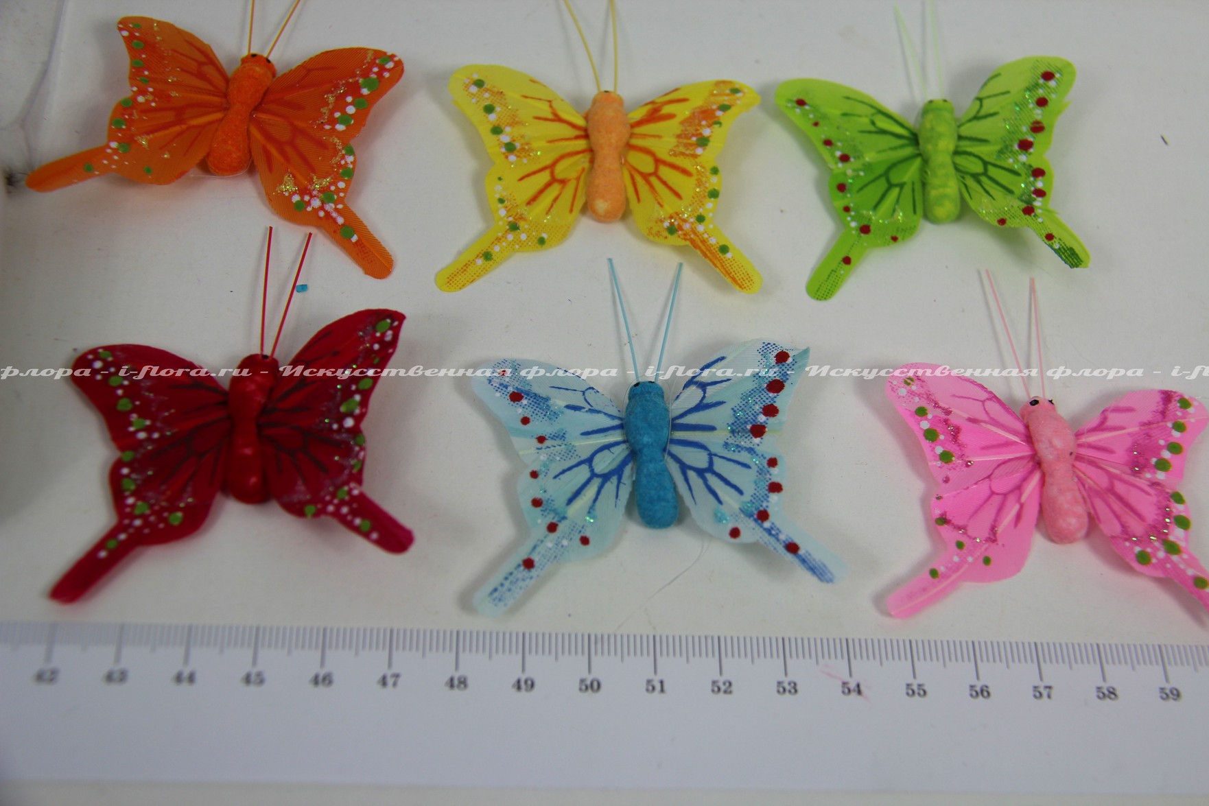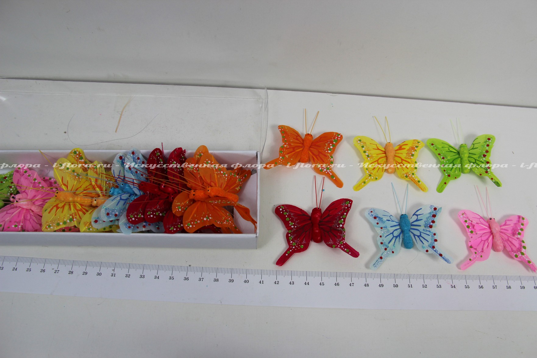 В упаковке 24 бабочки. В упаковке 6 цветов (зелёный, жёлтый, красный, оранжевый, голубой, розовый).