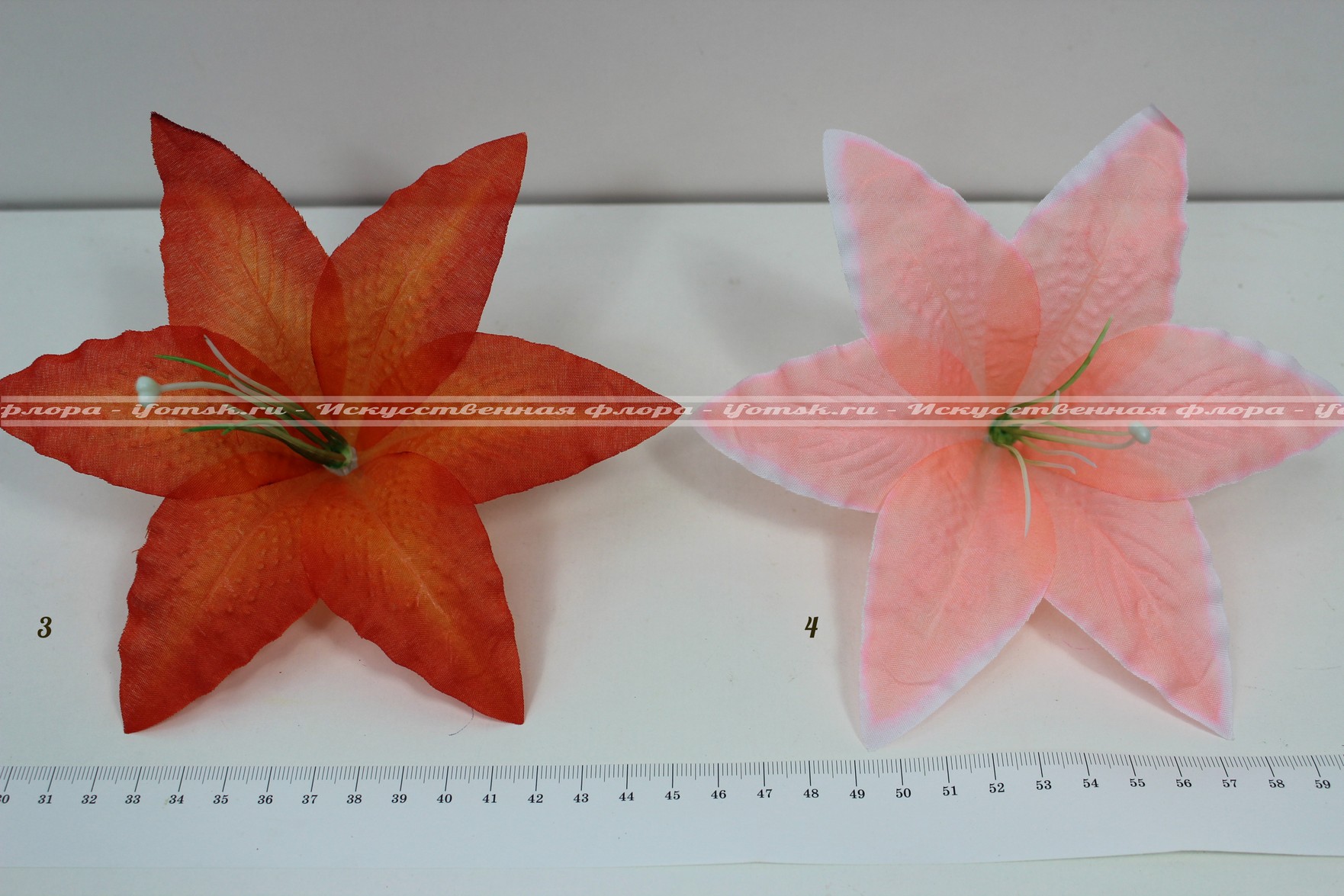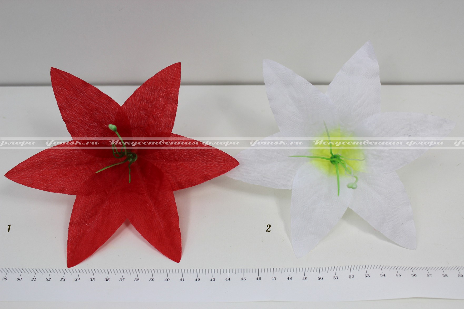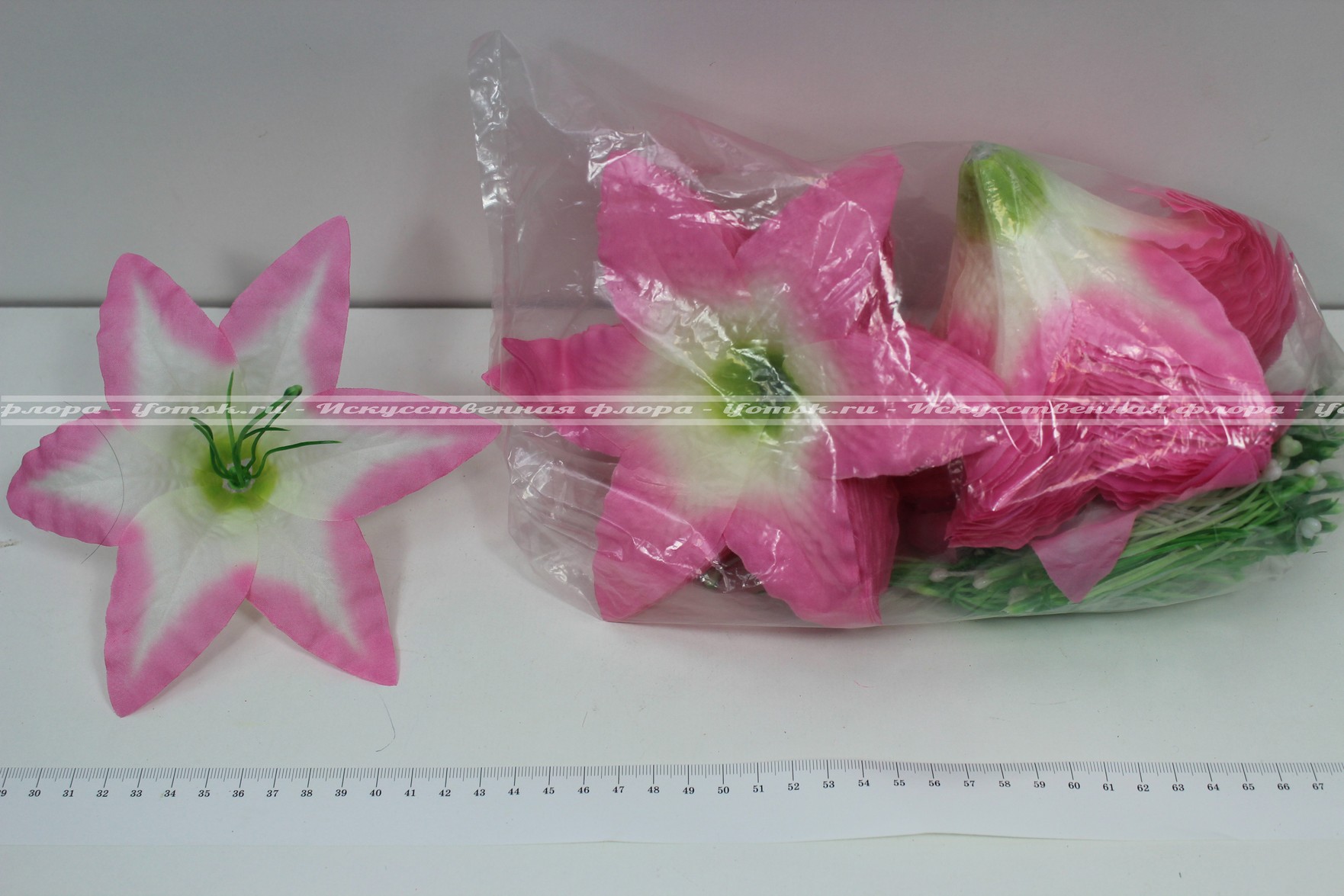 Ткань-шёлк, хорошо накрахмалена и держит форму лепестков. Цветок идёт в разобранном виде: 1-слой ткани 2-тычинки.