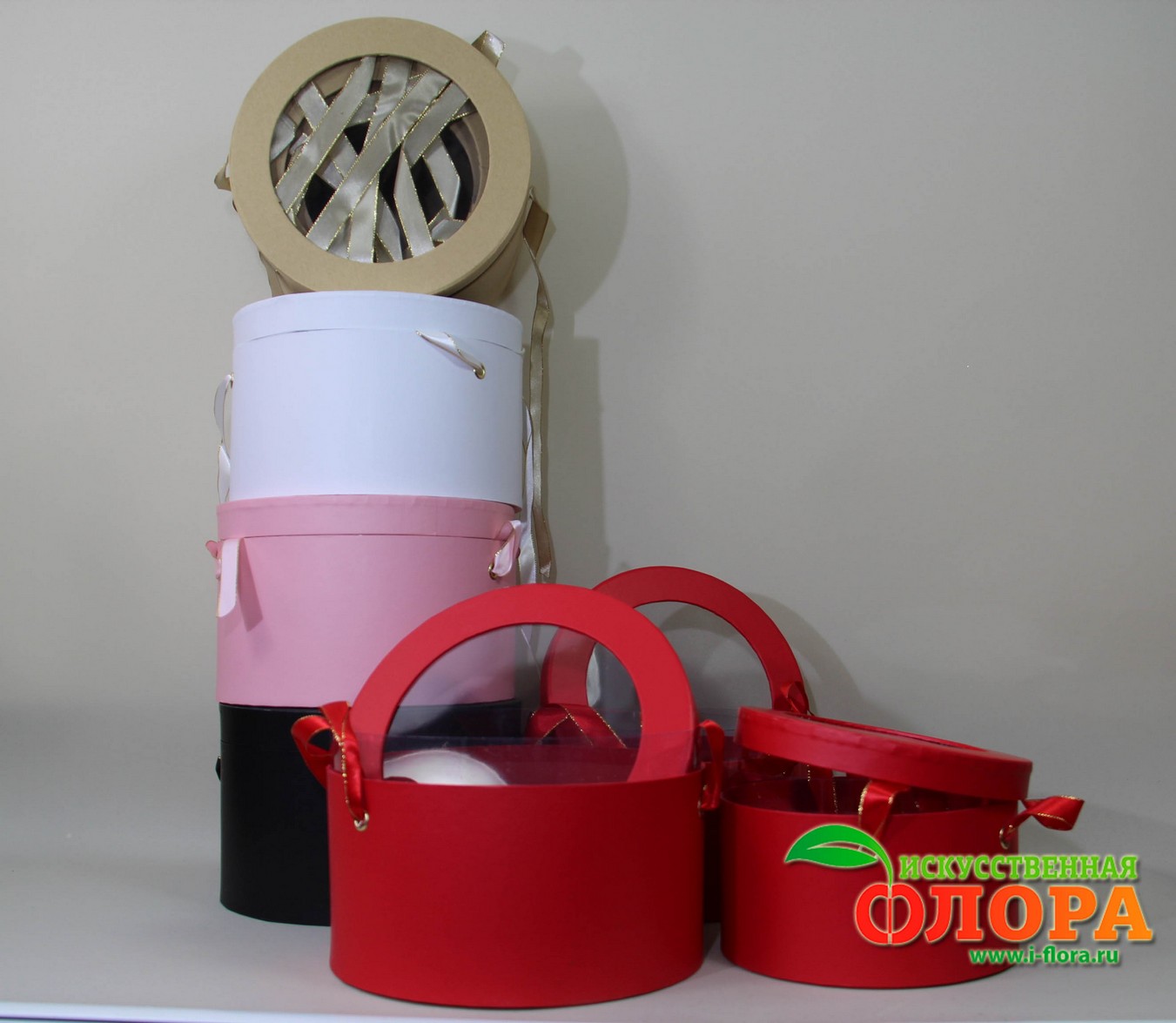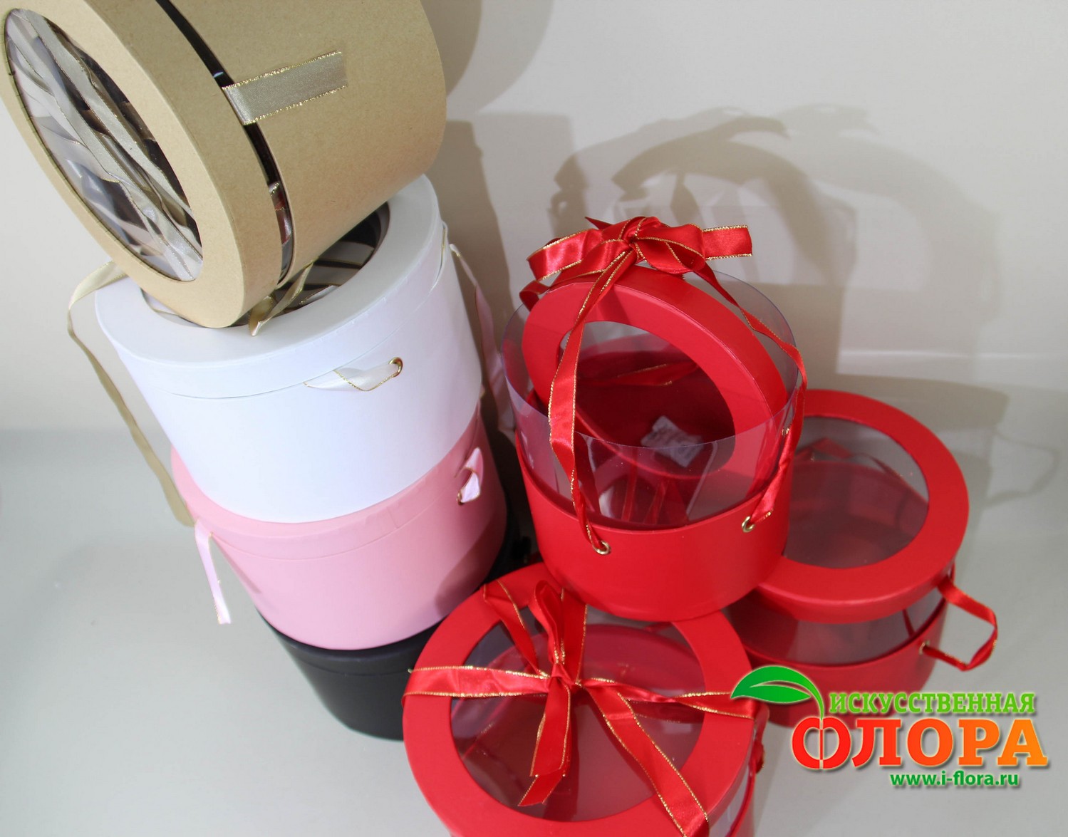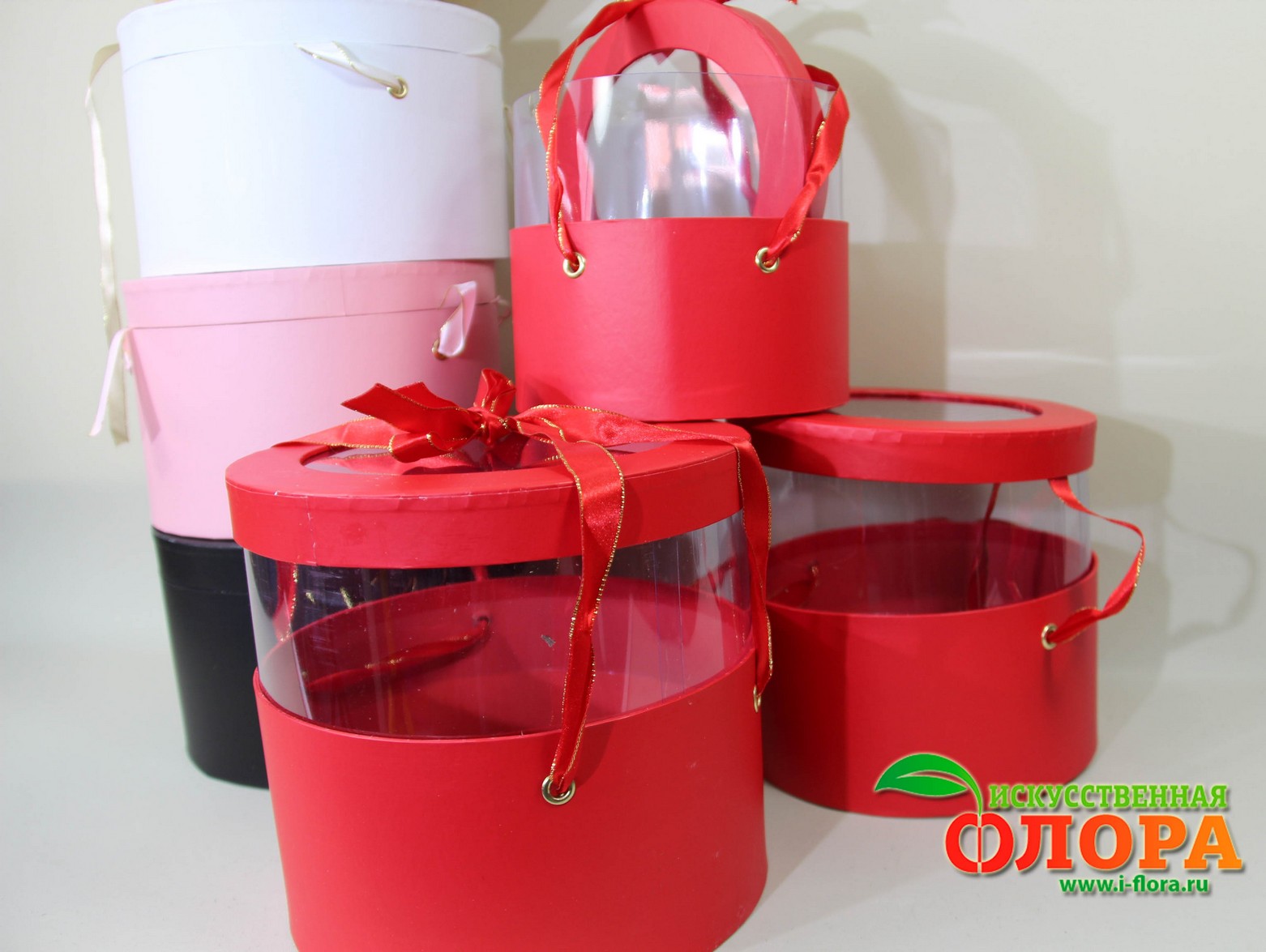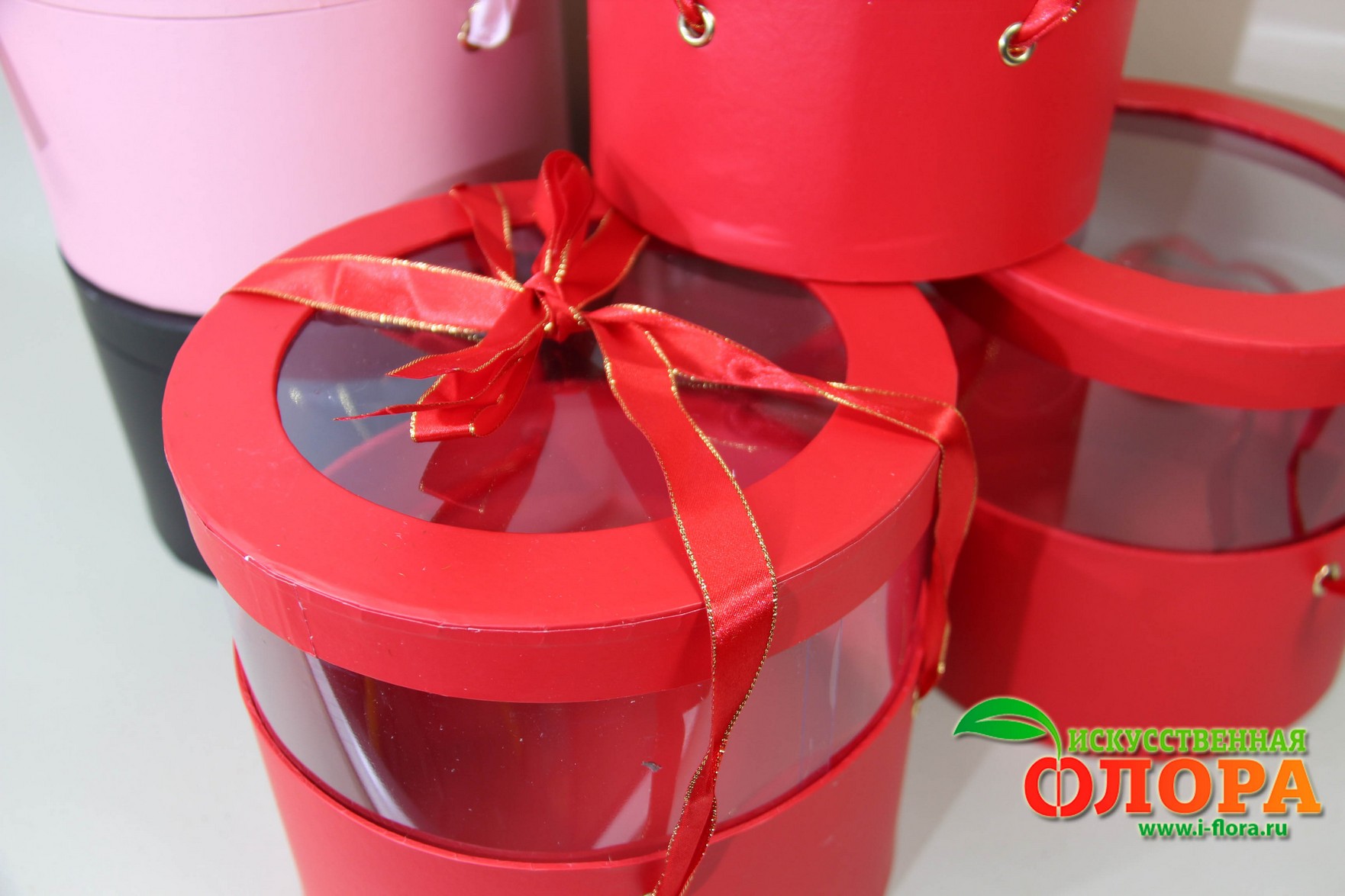 На крышке прозрачное окошко. Слегка потянув в стороны за ленточки коробка мгновенно увеличивается в высоту за счёт прозрачных стенок коробки до H-19 см.