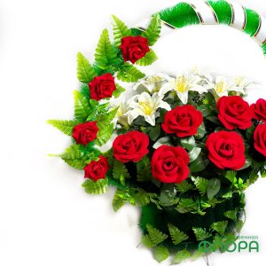 Материал: Бархатная роза, шёлковая лилия, тканевая и пластиковая зелень, лента.