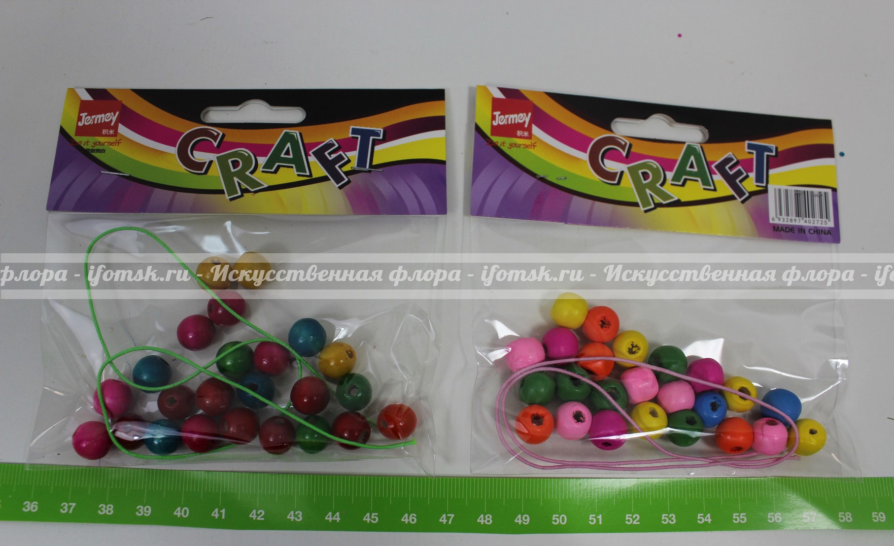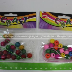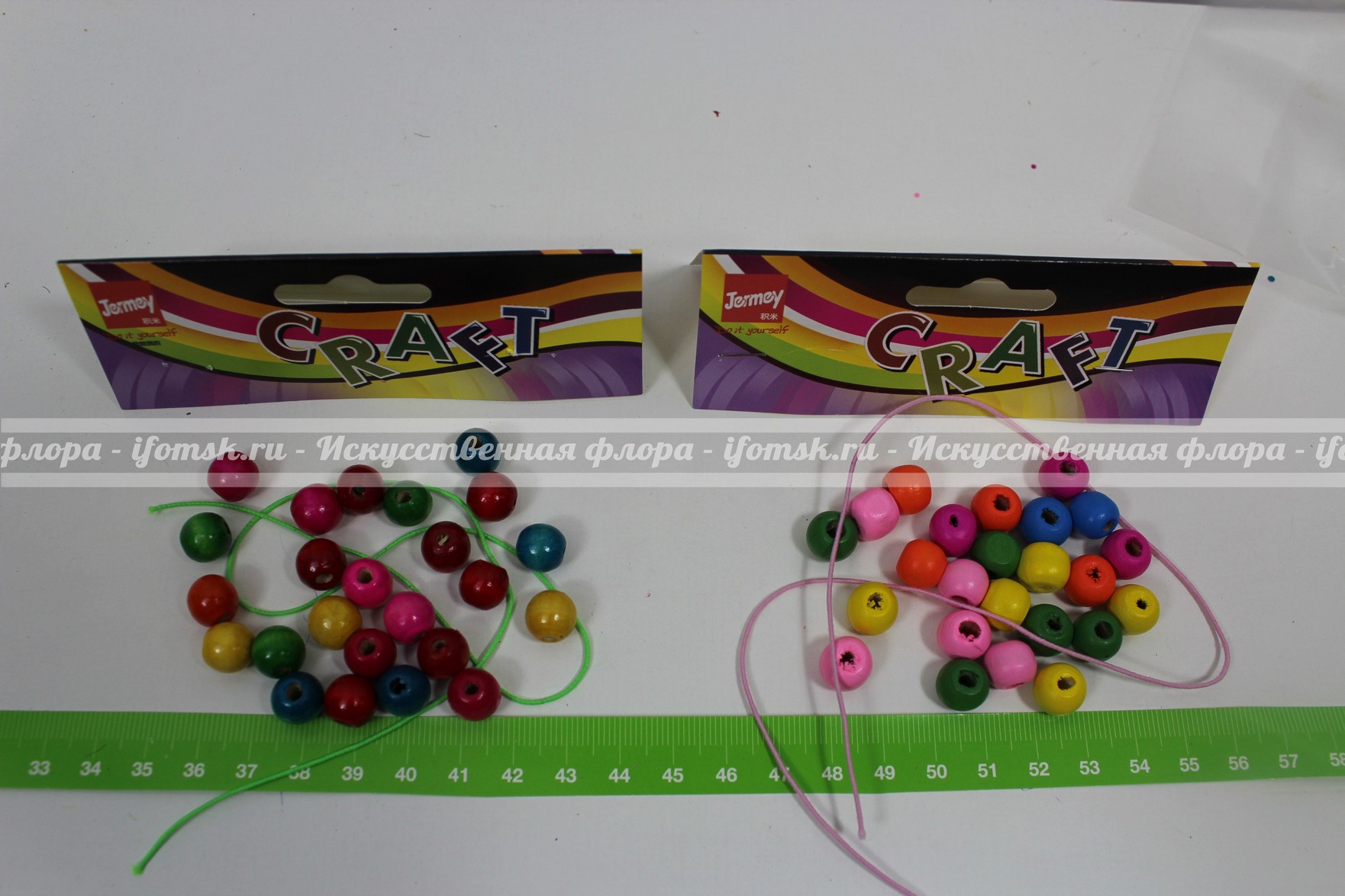 В упаковке разноцветные деревянные бусы с отверстием + цветная резиночка.