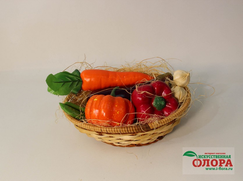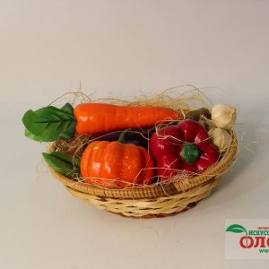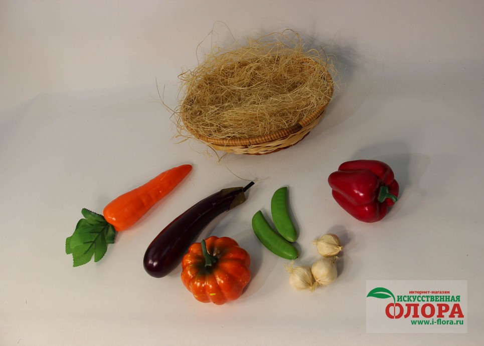 Набор состоит из: тыква-1 шт.; морковь-1 шт.; баклажан-1 шт.; перец-1 шт.; зелёный горошек-2 шт.; чеснок-3 шт.; плошка-1 шт.