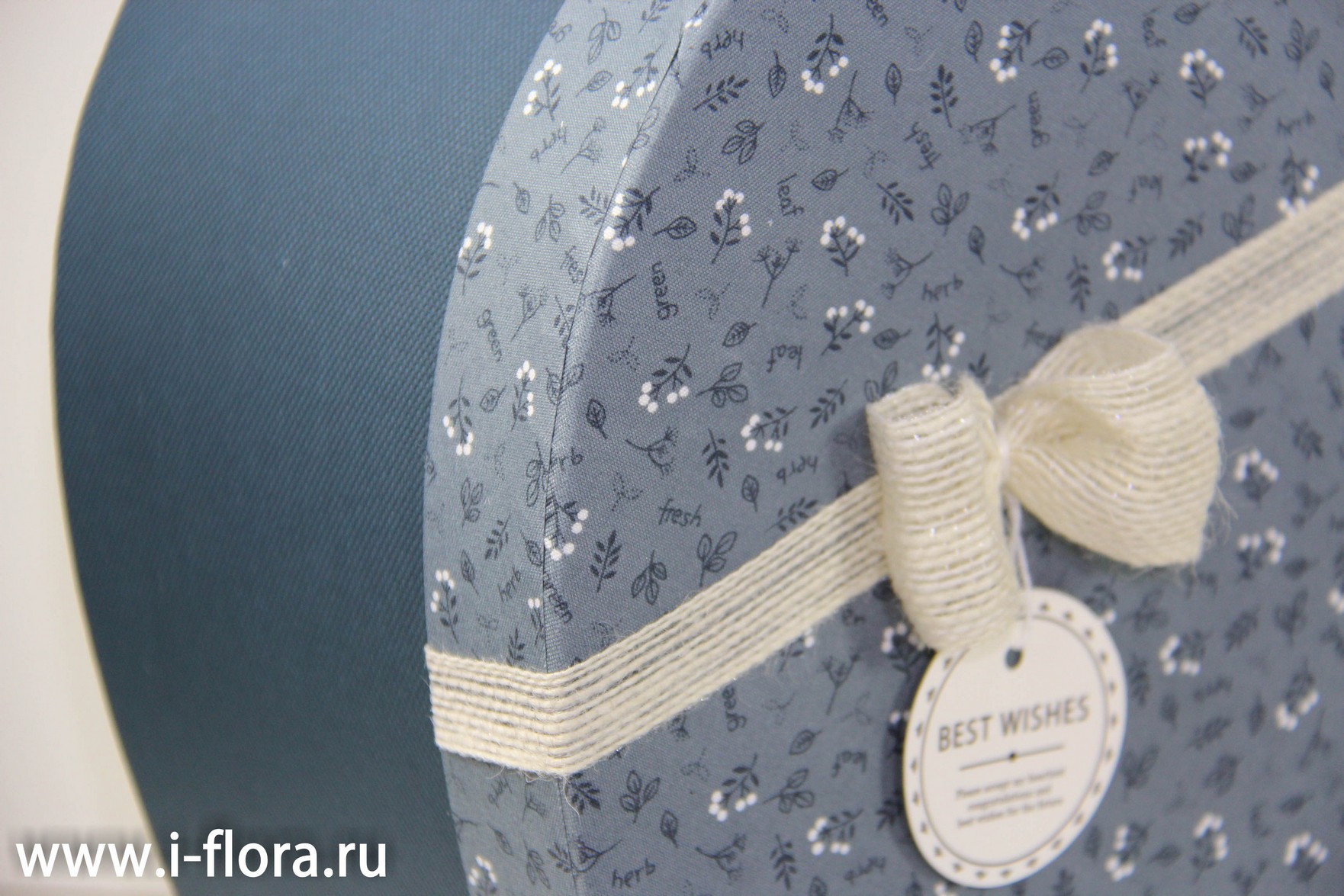 Материал: плотный формоустойчивый картон. Бумага коробки с текстурой льна. Крышка обтянута ситцем в мелкий цветочек, украшает льняной бант.