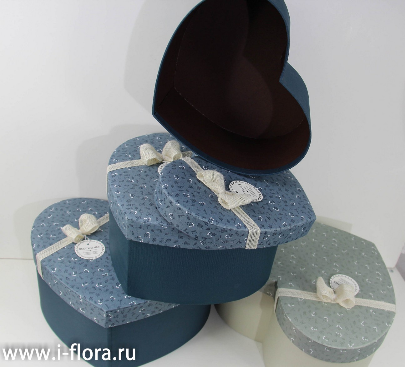 Материал: плотный формоустойчивый картон. Бумага коробки с текстурой льна. Крышка обтянута ситцем в мелкий цветочек, украшает льняной бант.
