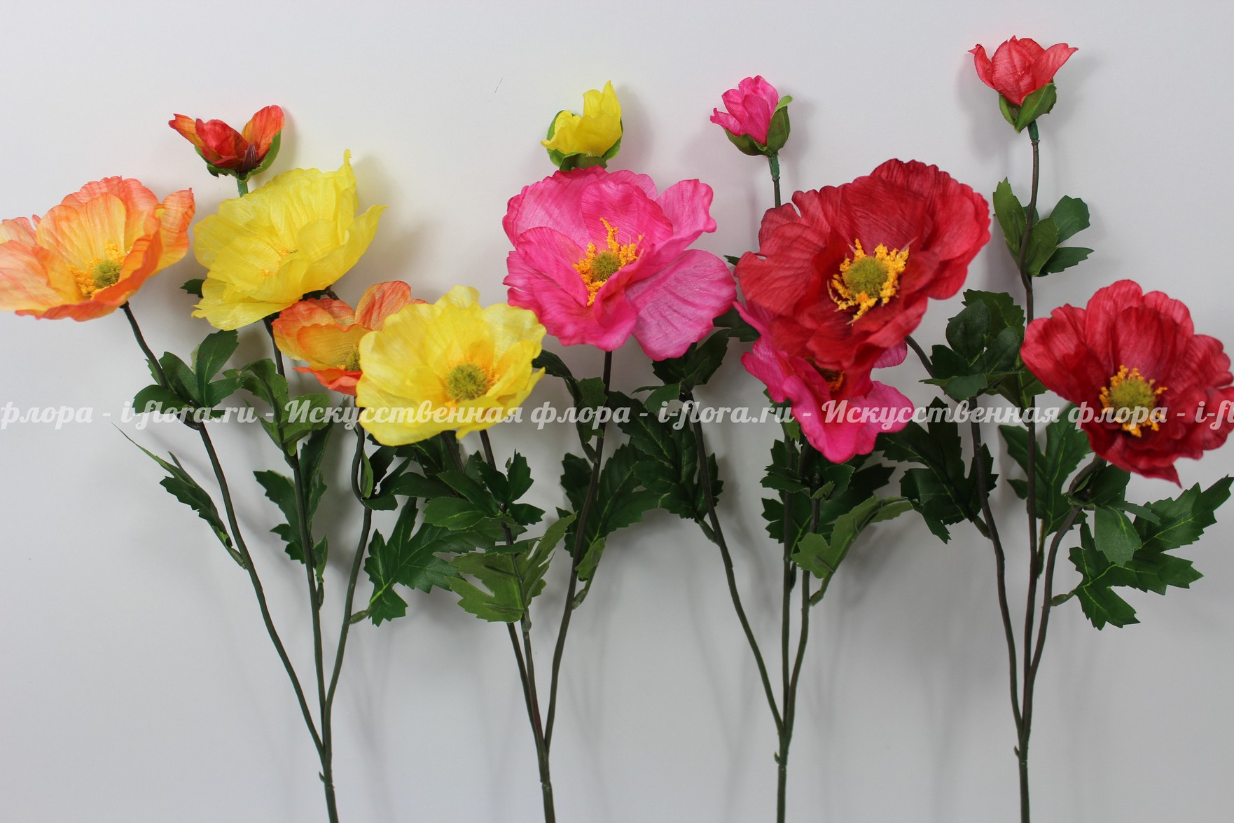 Ветка мака состоит из 2 головок диаметром 9 и 7,5 см. и 1 бутона. Ткань-полупрозрачный шёлк. Товар относиться к высшей категории качества.
