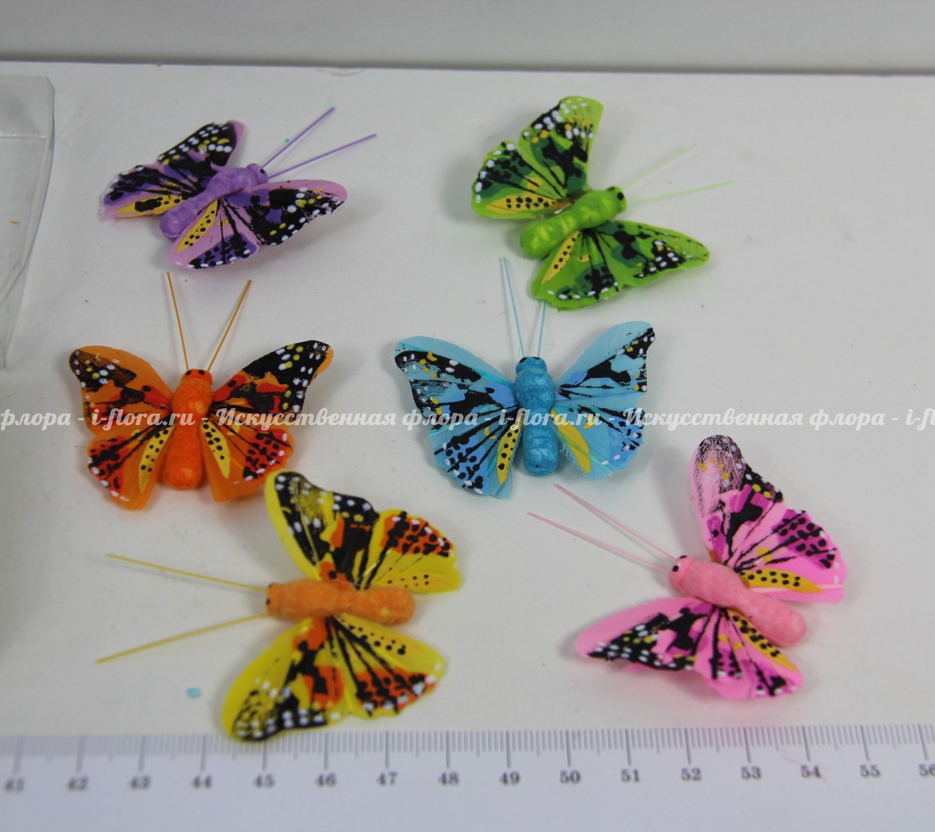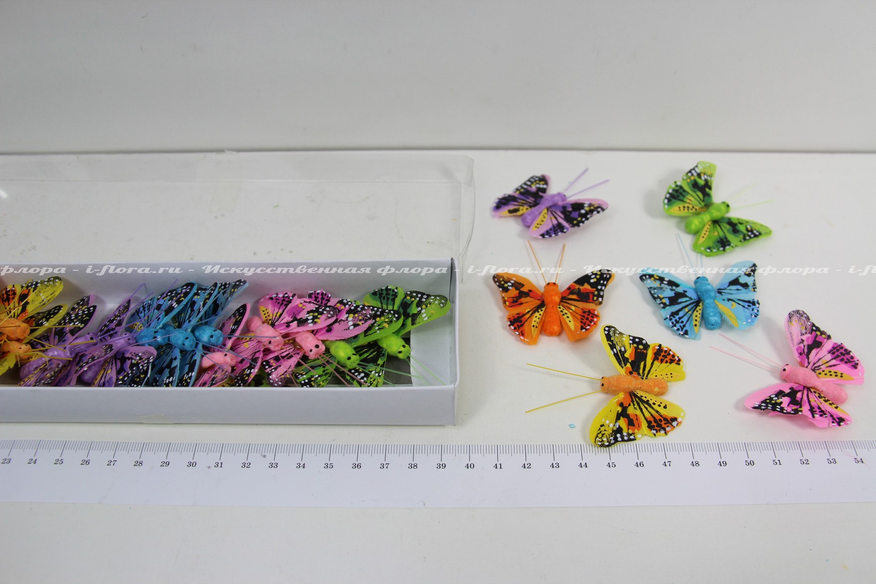 В упаковке 24 бабочки. В упаковке 6 цветов (зелёный, жёлтый, голубой, оранжевый, сиреневый, розовый).