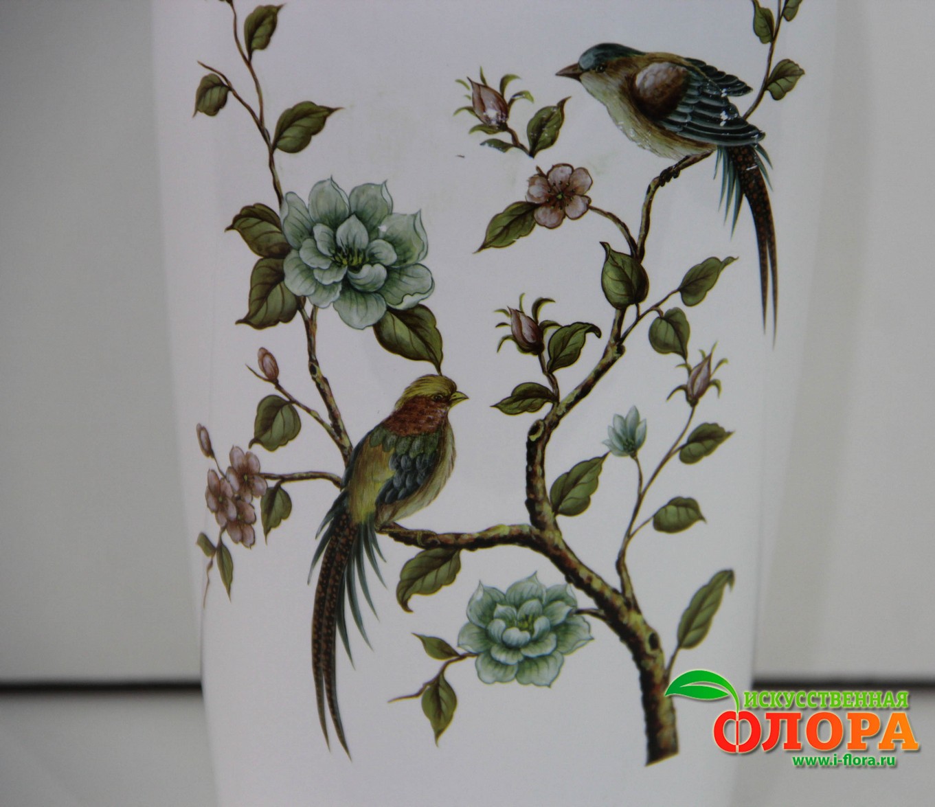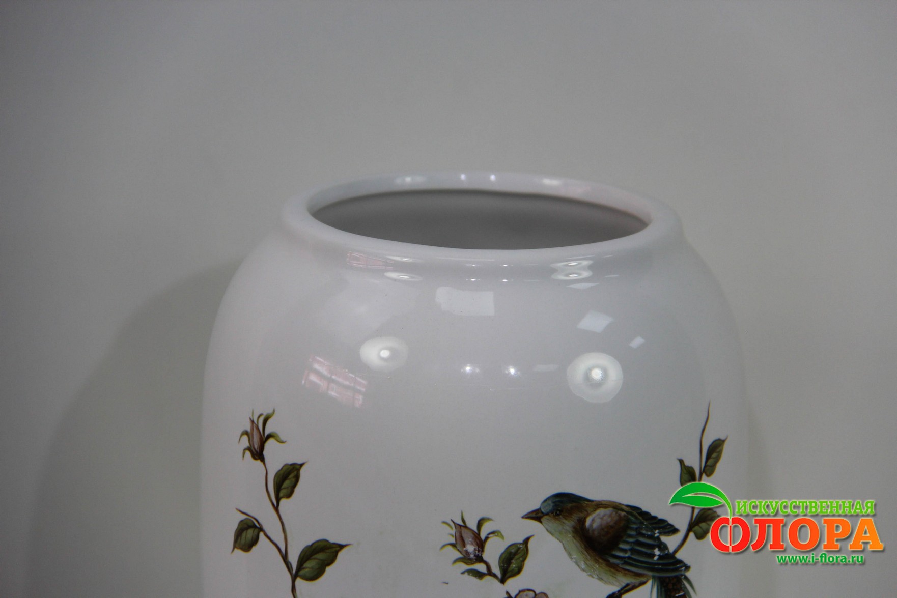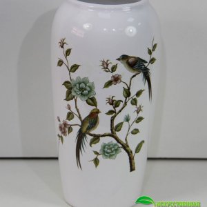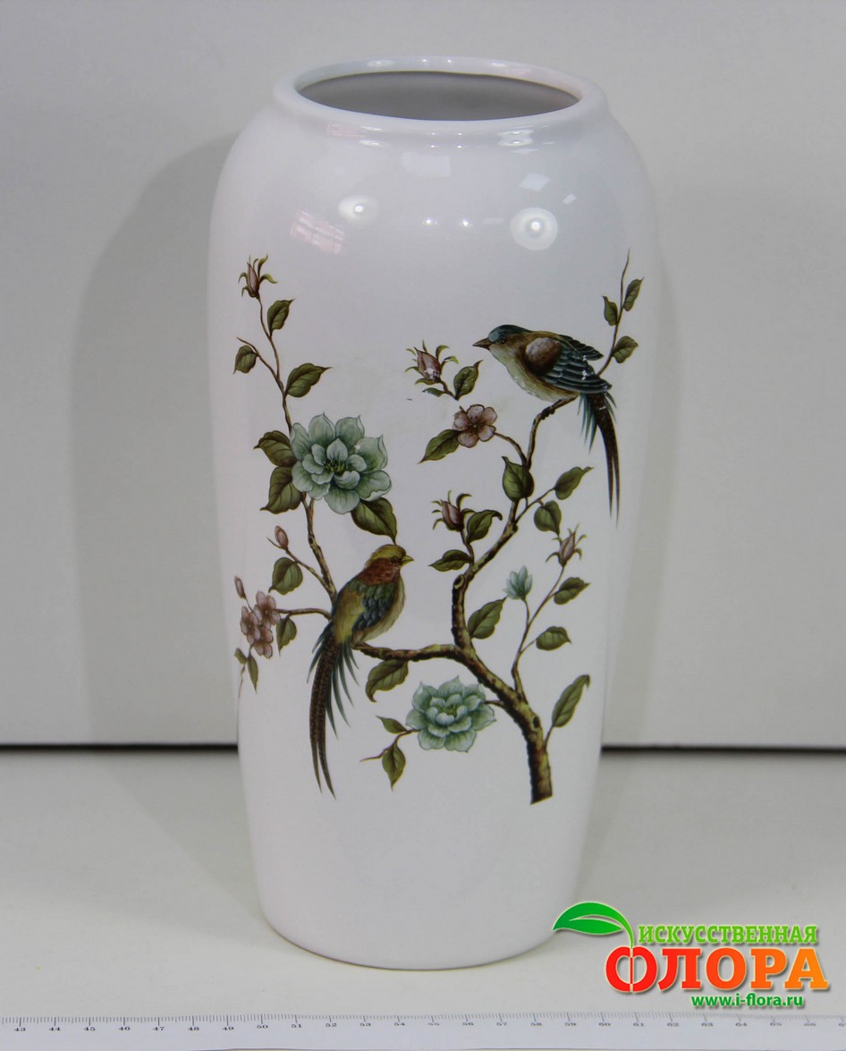 Ваза с рисунком птичек. Белая керамика, глазурованная с обжигом. Современный дизайн. Можно использовать в качестве вазы под живые цветы. H-27 см. D-13 см. Ваза поставляется в пенопласте и индивидуальной коробке. Цена за 1 штуку.