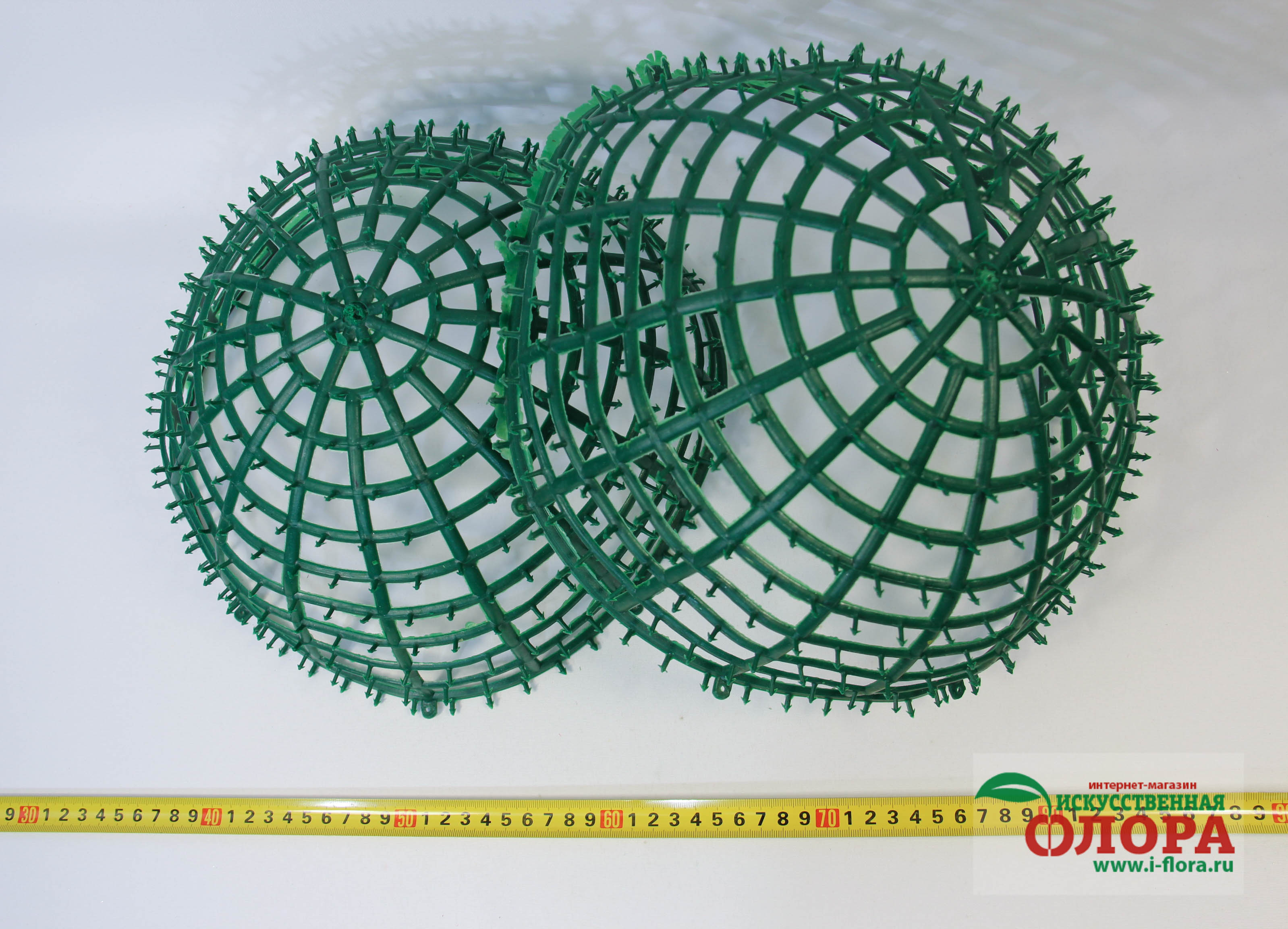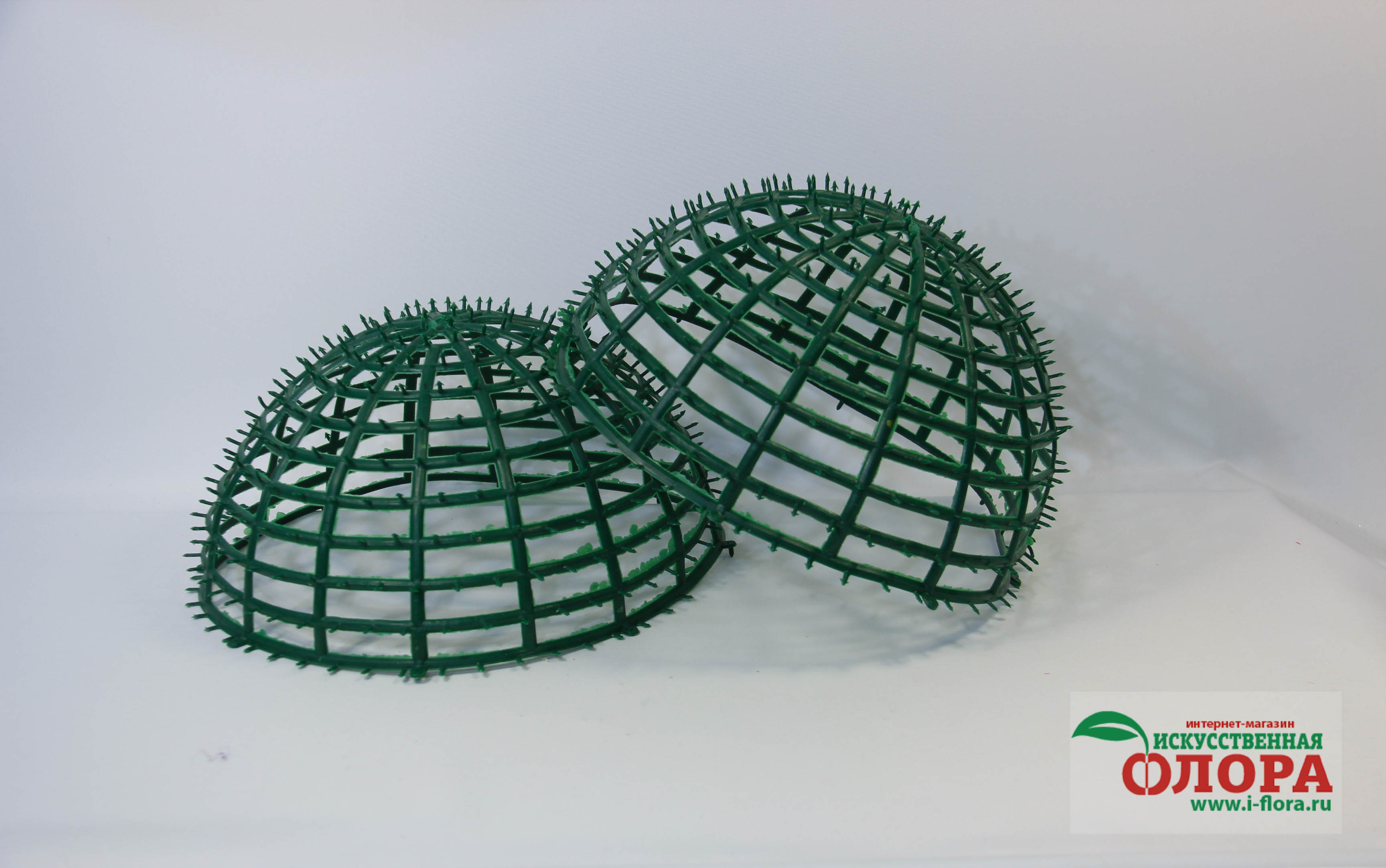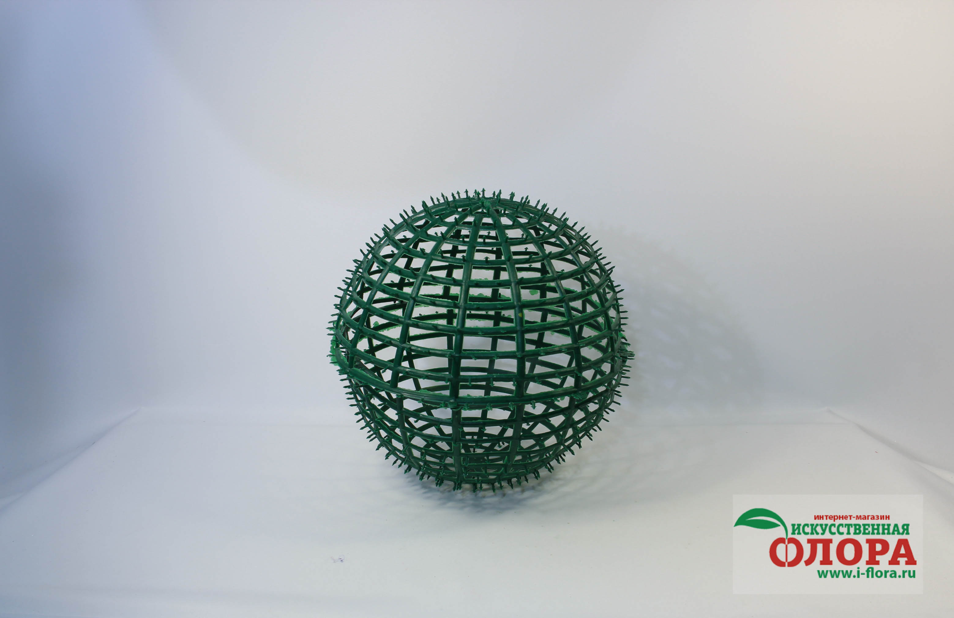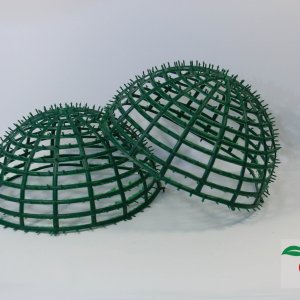 Состоит из двух частей, которые легко скрепляются между собой, образую прочную основу шара. В последствии множество шипов позволяет украсить его цветами или добавками из пластика.