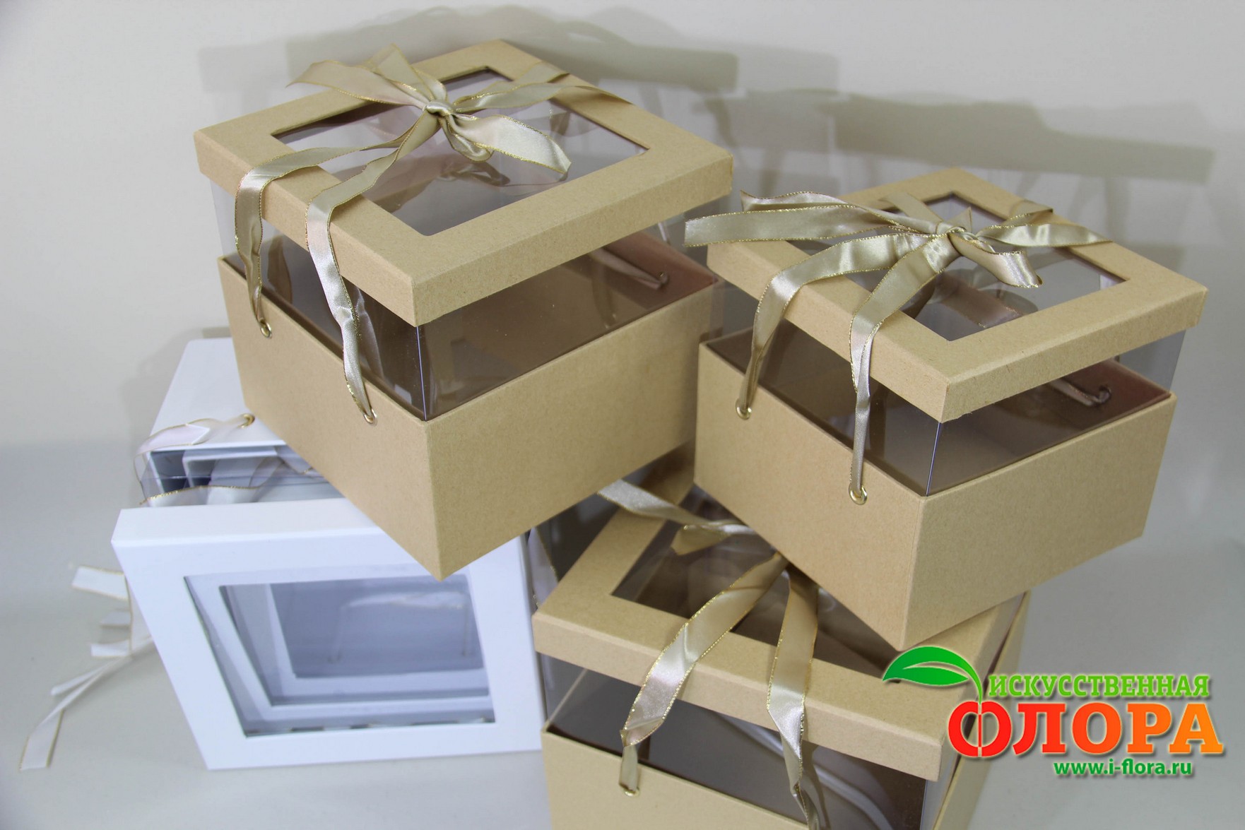 На крышке прозрачное окошко. Слегка потянув в стороны за ленточки коробка мгновенно увеличивается в высоту за счёт прозрачных стенок коробки до H-19 см.