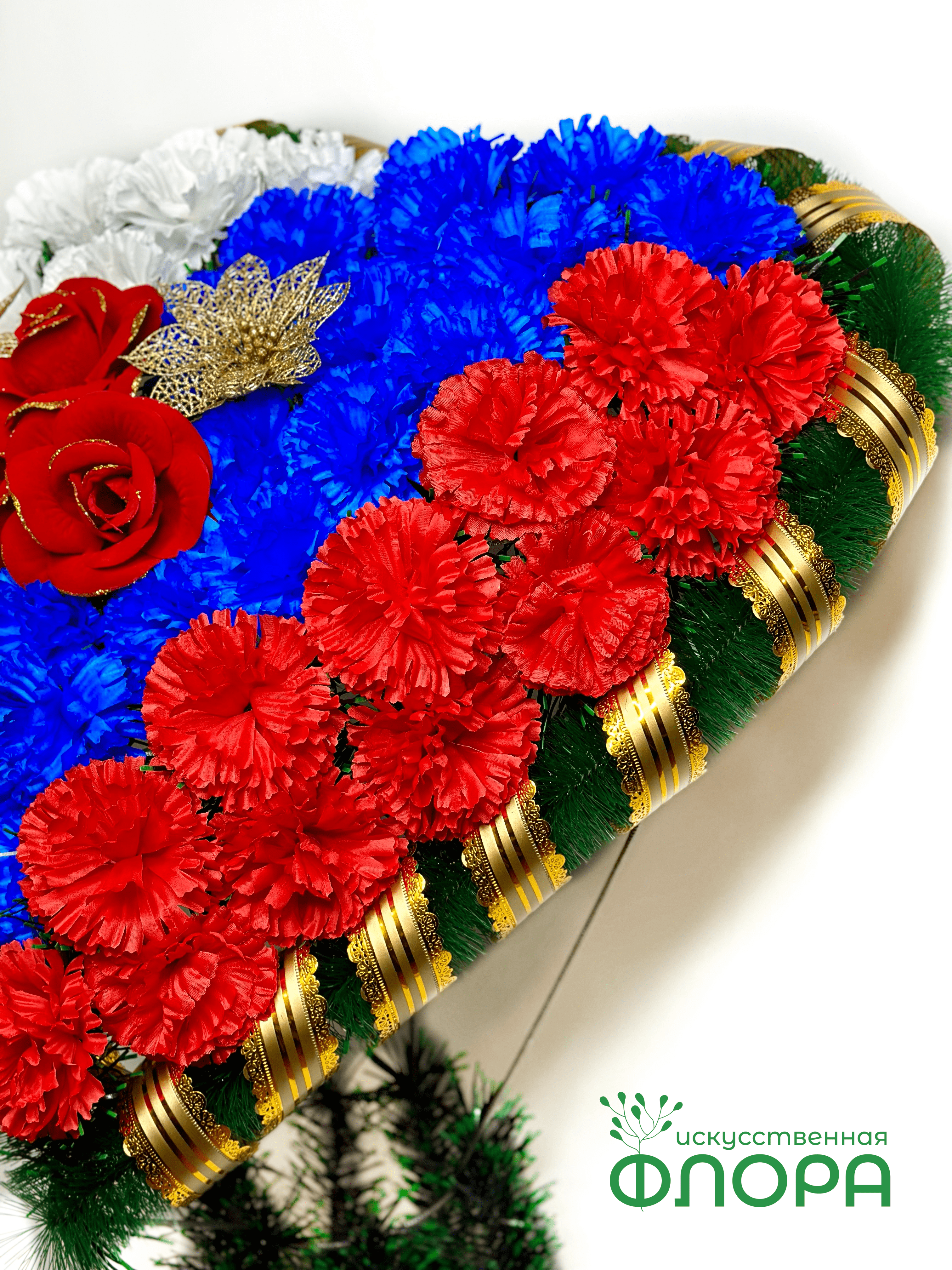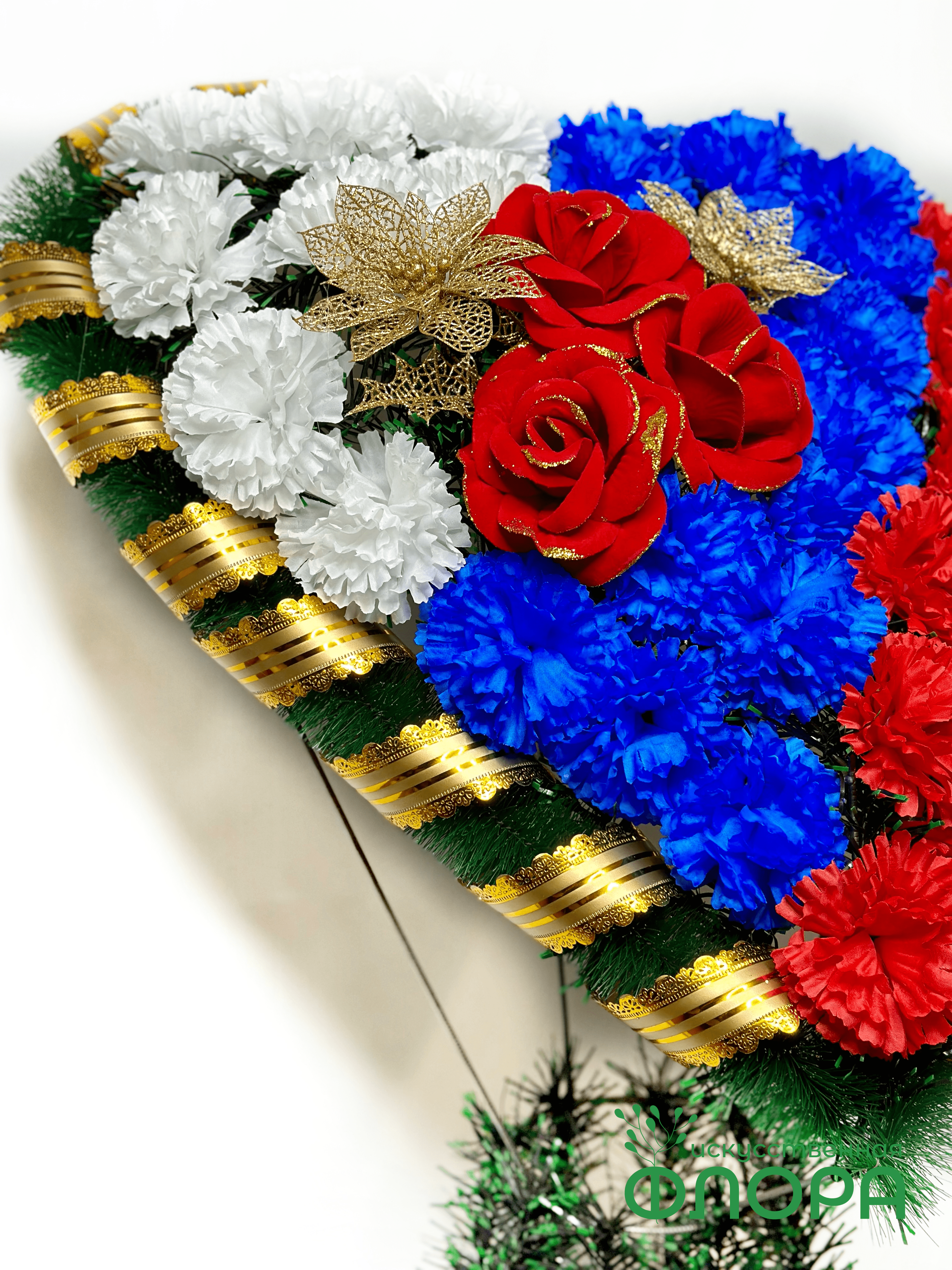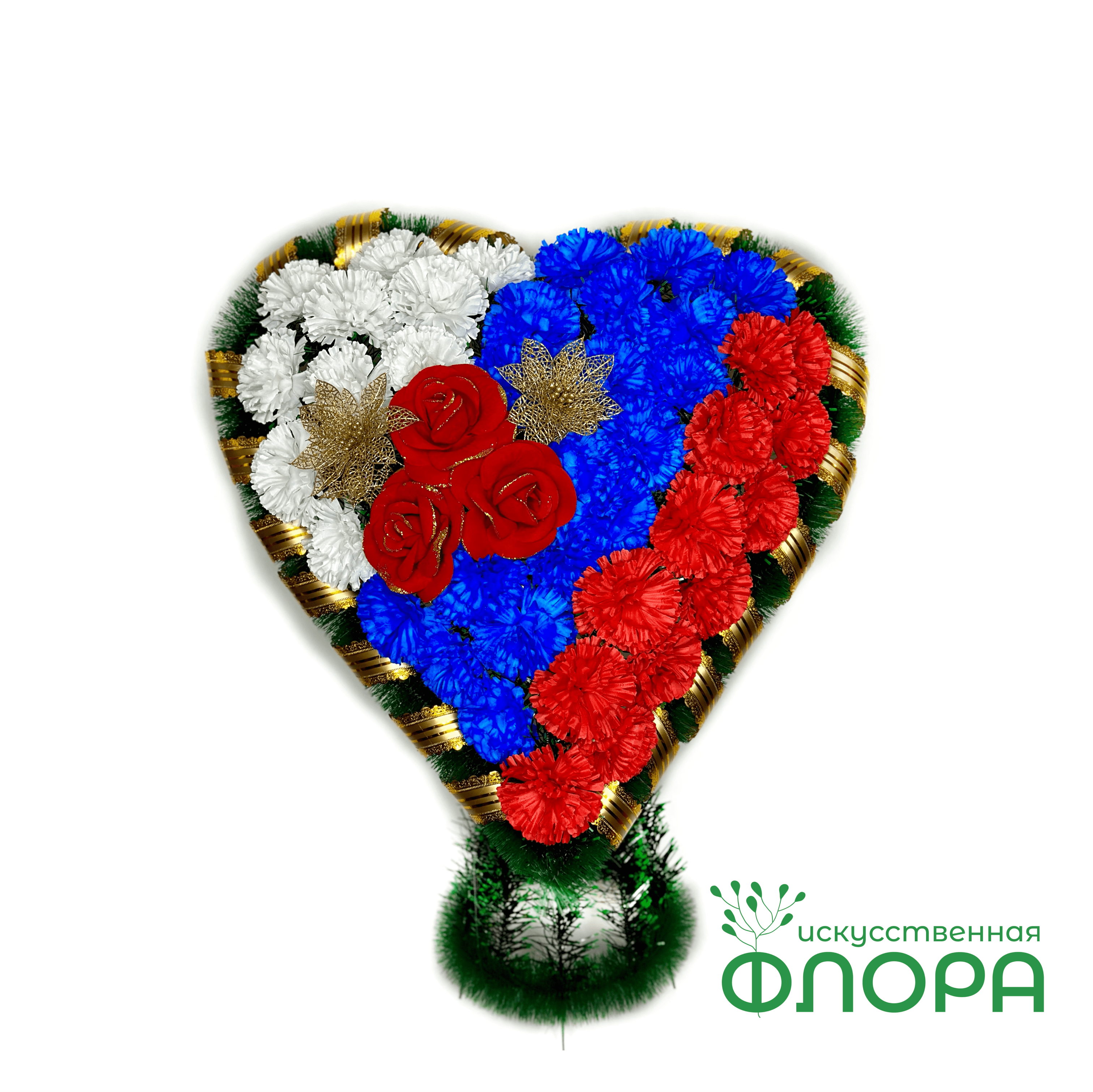 Корзина "Сердце на стойке" Триколор №1: собано из гвозики, бархатной розы, золотых веток, ленты.