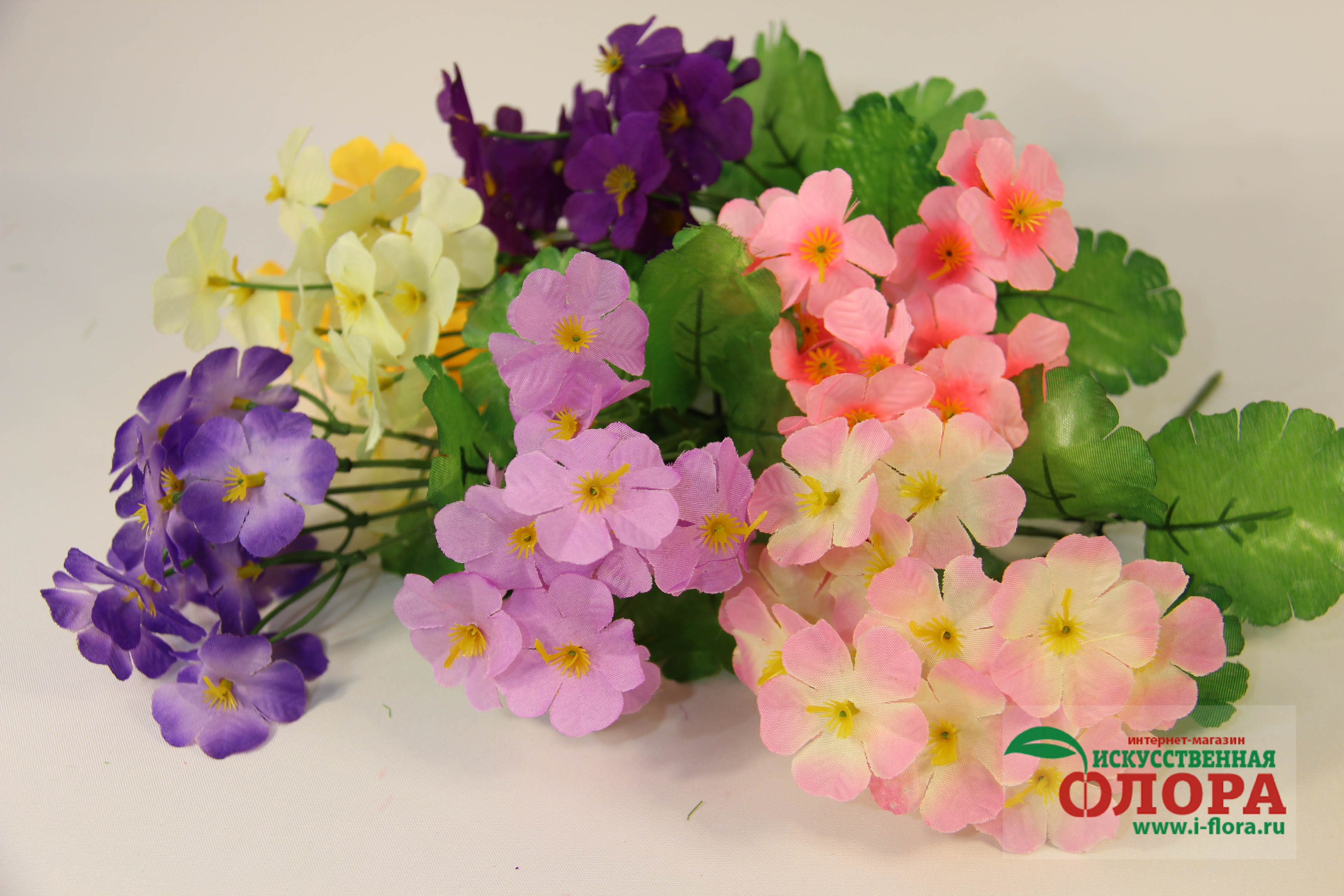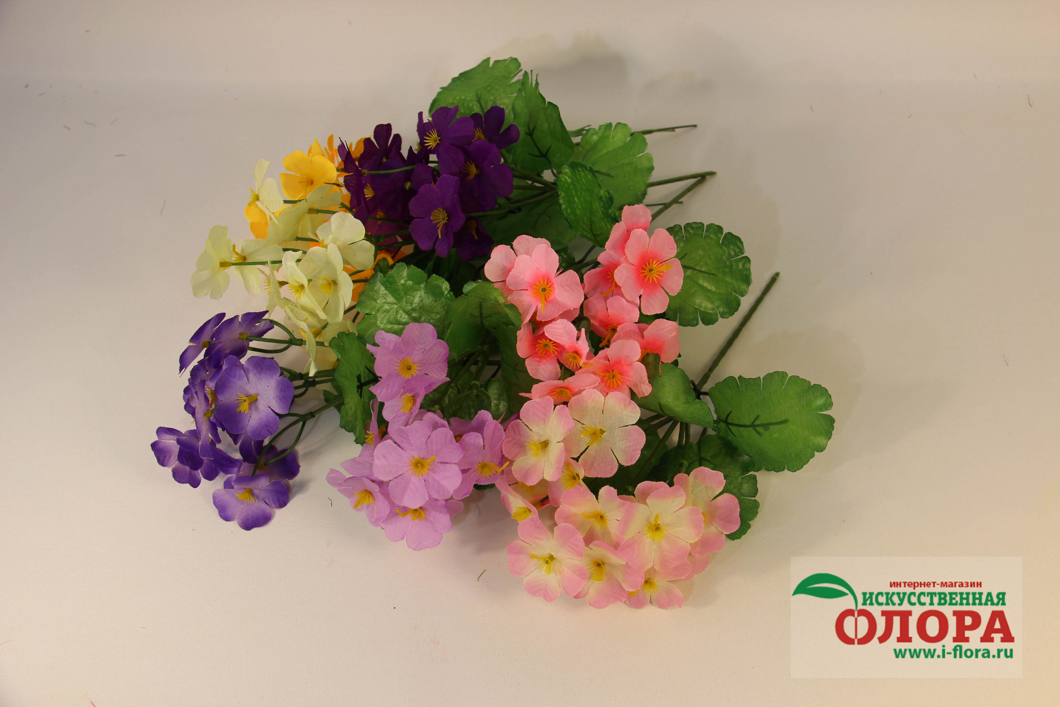 Букет фиалки мелкой. Цена за 1 букет. Фабричная - 25 штук - цвет микс (жёлтый, розовый, сиреневый, молочный, светло-фиолетовый, фиолетовый, ярко-розовый). Продажа упаковкой. В блоке выбора цвета указана цена за упаковку - 25 штук микс. Высота: 220мм.